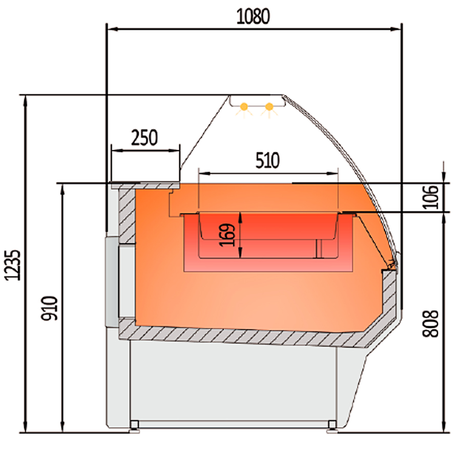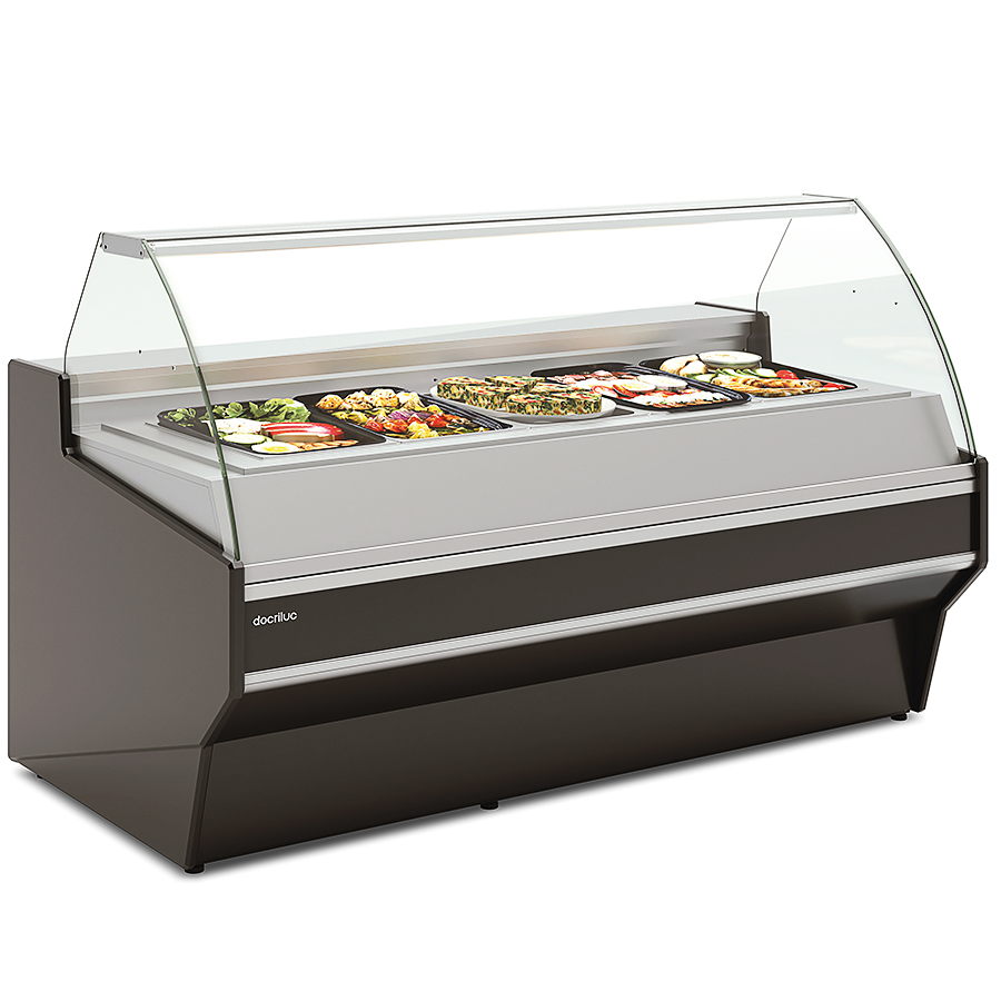 Vitrina Expositora Caliente Calor Seco 2 Cubetas GN 1/1-150 con Reserva Cristal Curvo Serie VESPER VE-10 – 1025x1080x1235h mm VE-10-10-HE C Docriluc