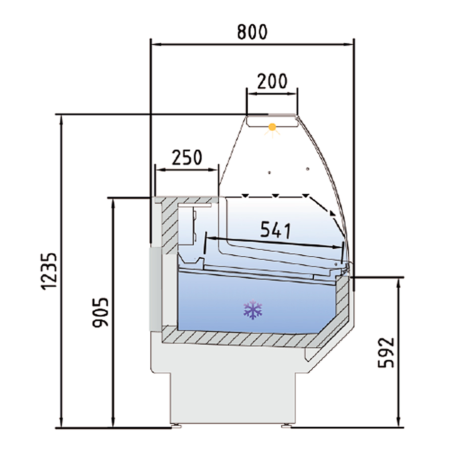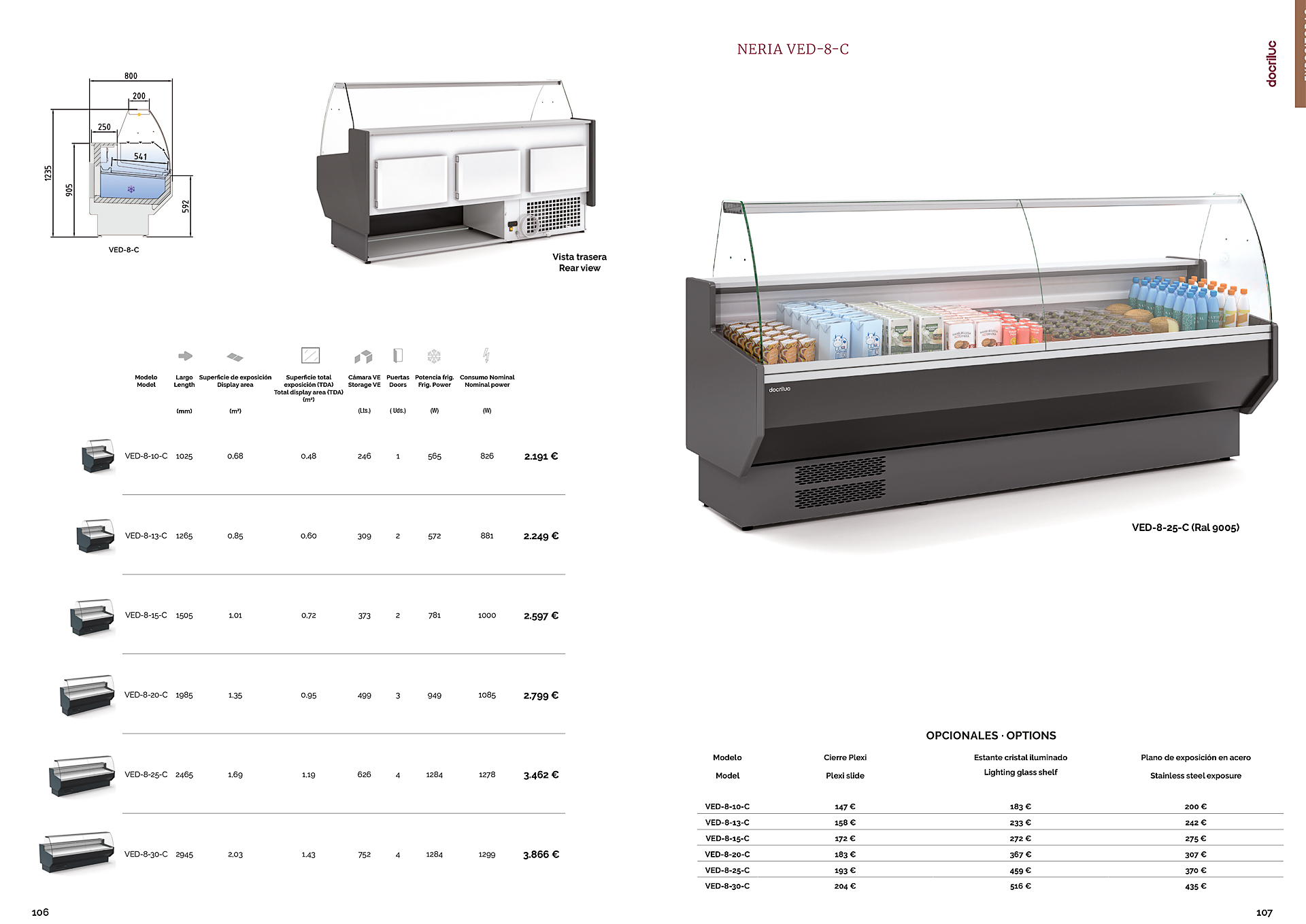 Vitrina Expositora Refrigerada con Reserva para Carnicería y Charcutería Cristal Curvo Evaporador Estático Serie NERIA VED-8-C 2945x800x1235h mm VED-8-30-C Docriluc