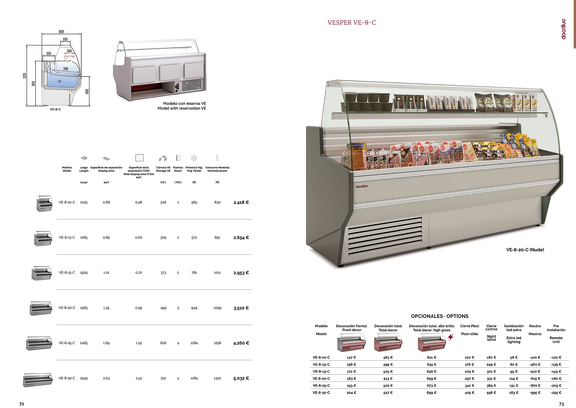 Vitrina Expositora Refrigerada con Reserva para Carnicería y Charcutería Cristal Curvo Evaporador Estático Serie VESPER VE-8-C 1025x800x1235h mm VE-8-10-C Docriluc