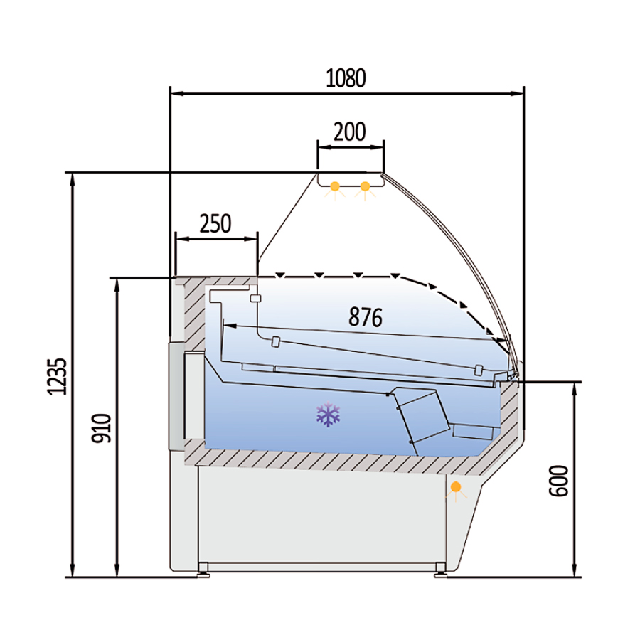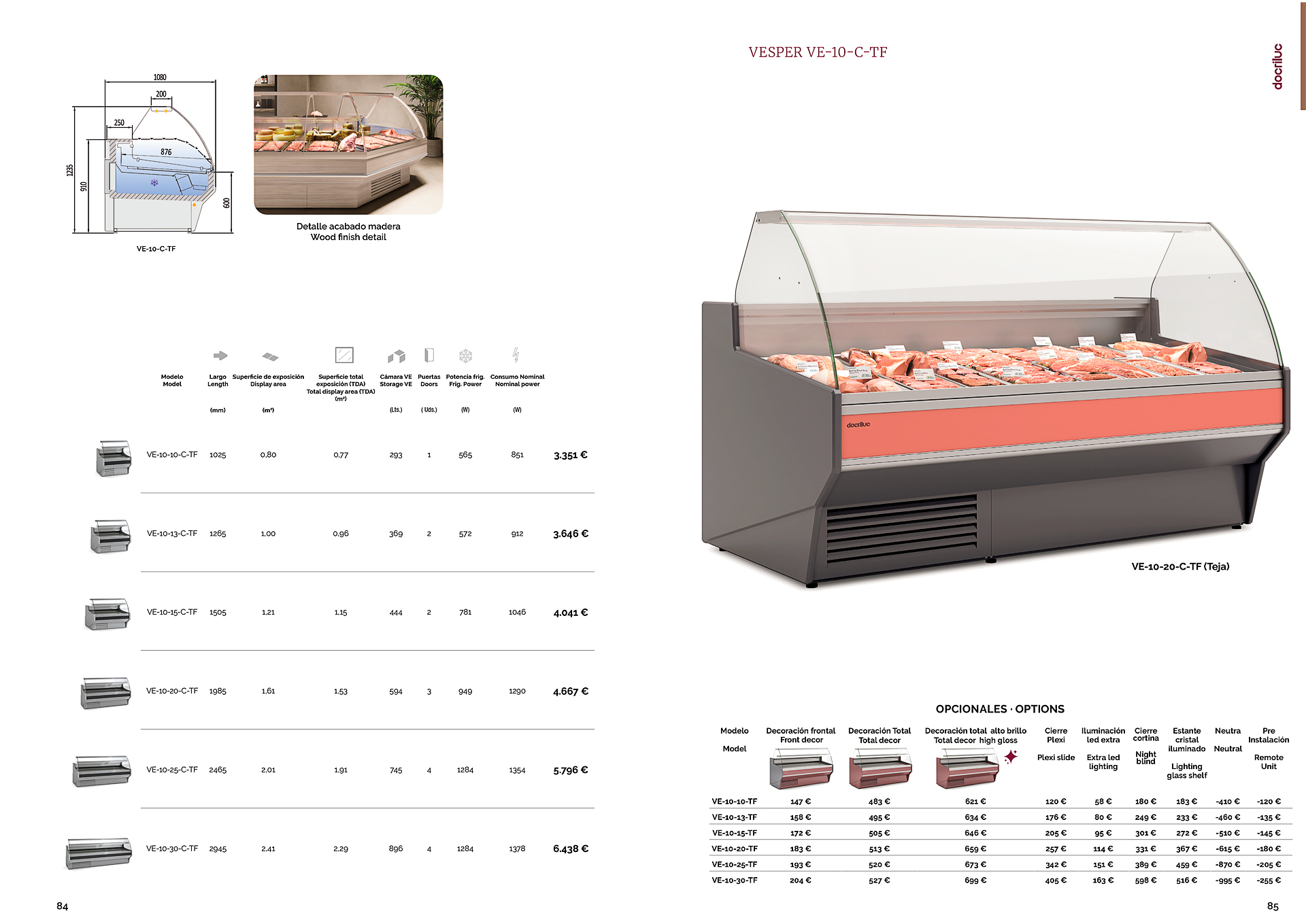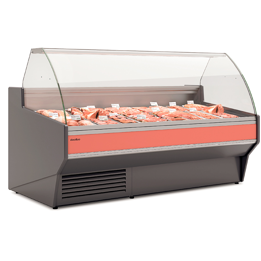 Vitrina Expositora Refrigerada con Reserva para Carnicería y Charcutería Cristal Curvo Evaporador Ventilado Serie VESPER VE-10-C-TF 1025x1080x1235h mm VE-10-10-C-TF Docriluc