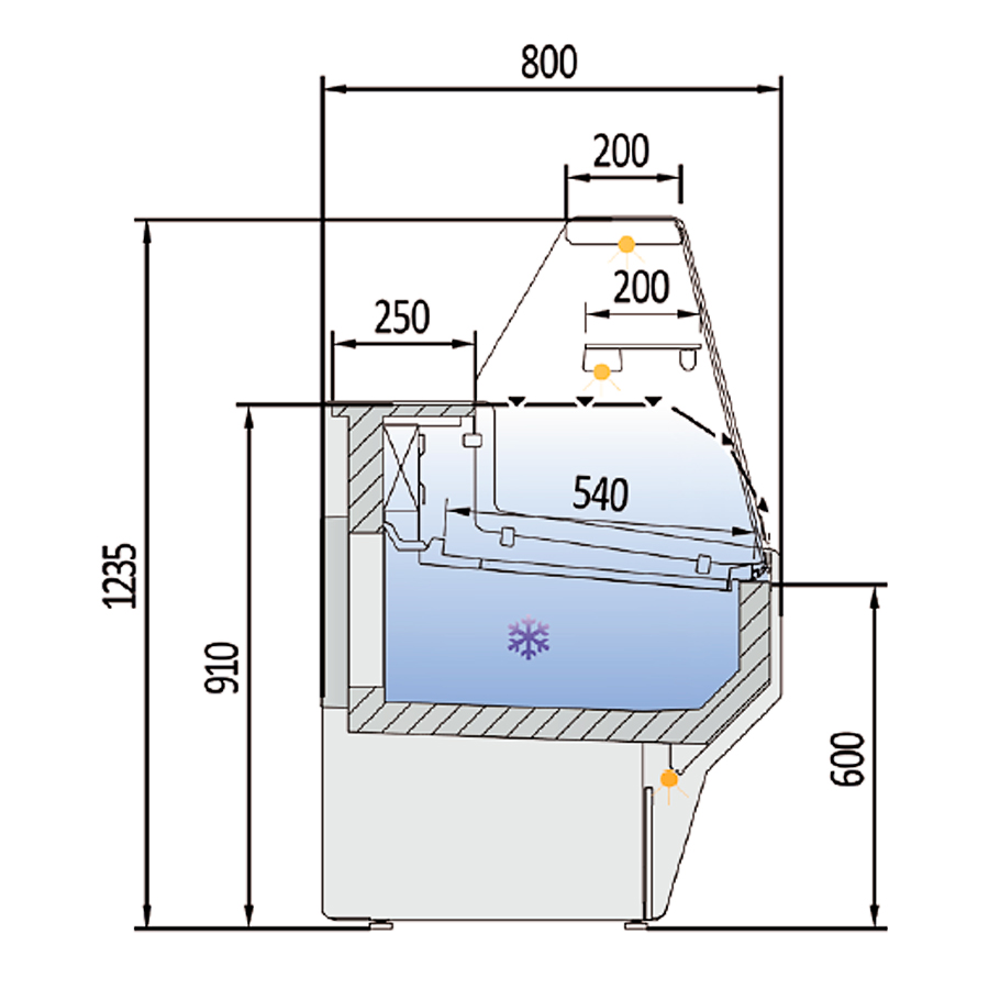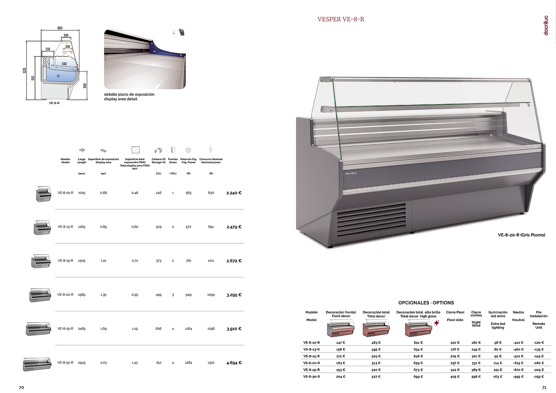 Vitrina Expositora Refrigerada con Reserva para Carnicería y Charcutería Cristal Recto Evaporador Estático Serie VESPER VE-8-R 1025x800x1235h mm VE-8-10-R Docriluc