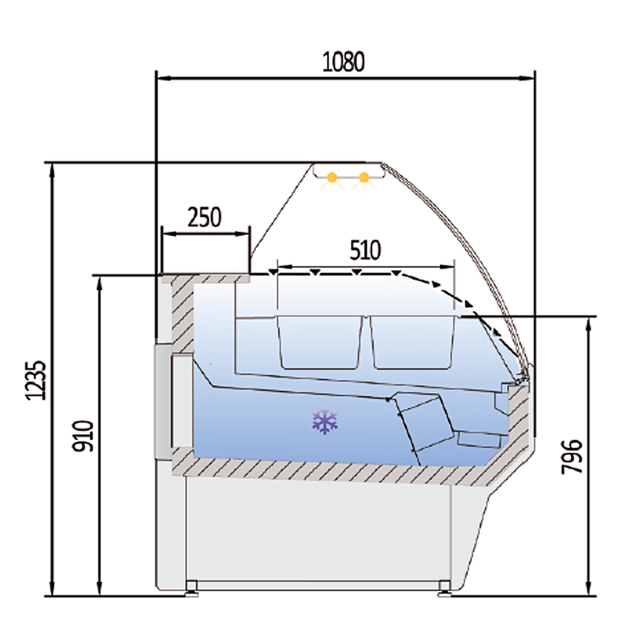 Vitrina Expositora Refrigerada 3 Cubetas GN 1/1-150 con Reserva Cristal Curvo Evaporador Estático Serie VESPER VE-10 – 1265x1080x1235h mm VE-10ES-13 C Docriluc